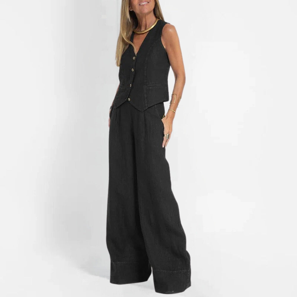 Das taillierte, an die Weste angelehnte Oberteil gleicht den fließenden, weiten Beinausschnitt aus und gibt Ihnen Bewegungsfreiheit mit einer strukturierten Note. Das elegante schwarze Finish macht es zu einem nahtlosen Begleiter für den Tag und den Abend.