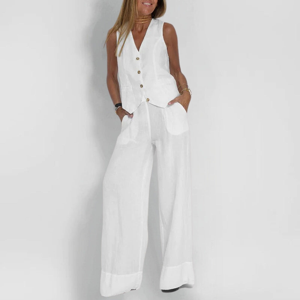 Dieses Hosenset mit weitem Bein ist perfekt für alle, die selbstbewusst, schick und mühelos aussehen wollen. Die fließende Silhouette und das taillierte Oberteil machen ihn zu einem Must-have für Momente, in denen Sie sich sowohl raffiniert als auch entspannt fühlen wollen - von Vernissagen bis hin zu legeren Brunches.